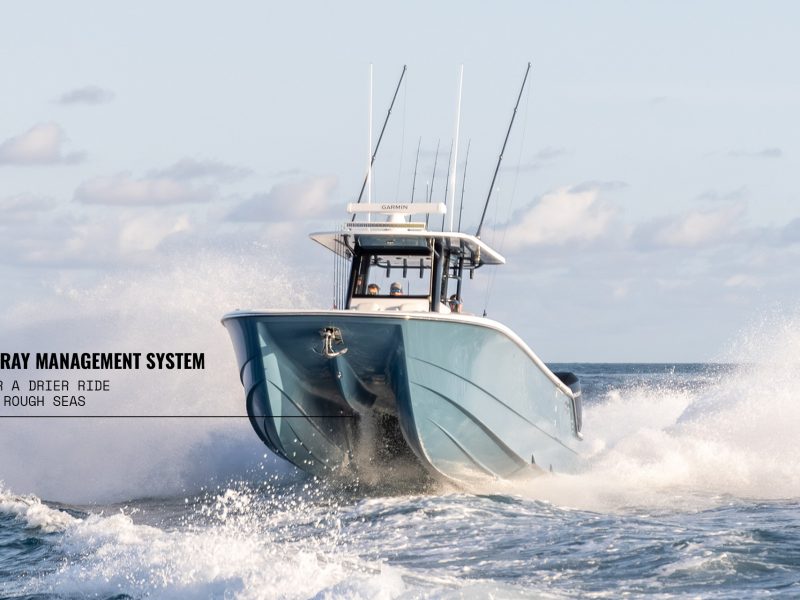 Working with renowned naval architects Morrelli & Melvin, the 36’ Catamaran features a hybrid asymmetrical hull. The inward lean of this patented design allows the boat to smoothly corner and slice through rough seas. The 36’ Catamaran follows the rise and fall of the waves to offer a smoother ride.